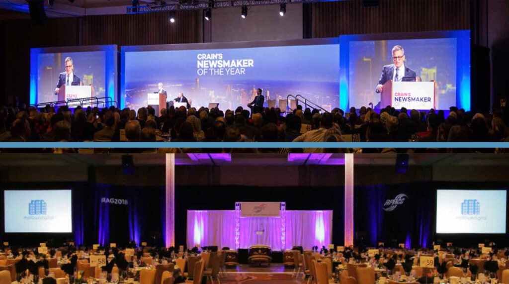 Equipment is all new and owned by Michigan Digital. Renting equipment increase cost and risk as rental gear does not always perform as it should. Screens are new and flawless, projectors are all Laser driven, insuring the brightest and accurate images. Our projectors utilize ultra-short throw technology that keep you projectors from taking up valuable floor space. Audio systems are all new and digital. Lighting is also new and LED based, lowering electrical needs and cost. Our equipment is designed to maximize floor space and simplify set up, strike, and operation, lowering costs to you.